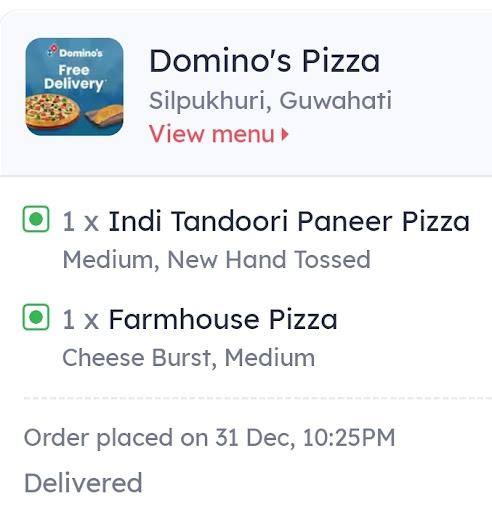 But my point is, what about the one hour I wasted waiting for the order? I had to head to Khanapara to catch another bus, so this delay was incredibly inconvenient. In all my previous orders from Zomato, at least they provided a carry bag. This time, however, Domino's in Silpukhuri decided to use their own delivery person instead of Zomato's, which resulted in the delay.