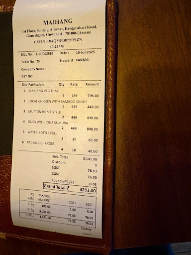 Go for this place if you want to eat traditionally ethnic food go for this place located at Hengerabari, Ganeshguri. They have their speciality 'vator kanhi' thalis for what you choose be it veg, chicken, even local chicken is available here. And duck and pork. The recipies are varietyful in a kanhi. Even for a veg thali you get around 7 recipies. I ordered for a pork thali that included the starters roasted papad and a veg soup which is an appetizer. The actual thali is a veg thali with 2 extra items and 3 pork item. Pork with mustard green leaves, then comes boil pork , then there is juicy smoked pork full of fat creams. The extra fish fry salad is a very tasty addition. So anyone who wishes to eperience assamese flavour I will suggest to visit Maihang for sure. And the kheer is a...