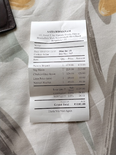 Read moreWe had a very disappointing experience at AHA bhojanam Here’s what went wrong: • Crazy Chicken Lollipop: For the price we paid, the quality and taste were a huge letdown. Ambur Dum Biryani’s chicken kebab, which costs ₹150 for six pieces, tastes much better and offers far more value. • Boneless Chicken Biryani: It wasn’t boneless chicken at all—just tandoori pieces mixed into biryani rice. This felt misleading and poorly prepared. • Mutton Biryani: The dish was all masala, with no balance or proper flavors. • Kaju Curry: This was the worst dish we’ve ever tasted. The curry was spoiled, and the kajus were soggy, soaked in bland tomato puree, making it inedible.