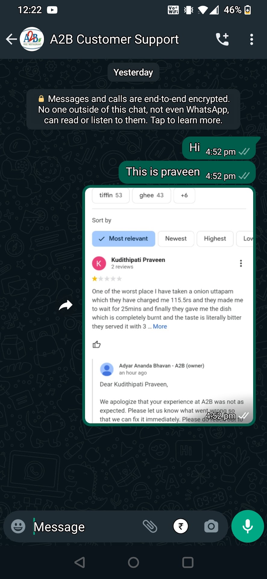 Read moreWorst service. I visited there the Idli base price was 40 and 2 rs gst. My mobile phone was switched off, so could not pay online. I provided him cash 100rs, he denied giving saying I don't have 2 rs change. (I know logically it should be 8 but these were his words). I reiterated kya bhaiya fir nahi dena hai kya. He said irritatingly, either pay through machine or get the change. I did not like the way he spoke and found it insulting having standing there with money and he denying it for 2rs even though I was providing more than actual 42. I was literally like bhyi tu 50 kaat le but tameez mein toh bolna chahiye. But I found this insulting, the way in which he spoke so I stepped down from the shop without uttering a word and decided never ever to go there. Even my friend told he visited during closing time, though people were sitting and eating the staff denied saying it's closing time, he too went for idli. You need not cook, right? Just provide it, still. If higher management sees this review then take care of staff not to be concerned just about their monthly salary but atleast not to insult customer in a hospitality business. It affects your image as now in front of me. Earlier I used to visit for lunch and dinner. Though it was overpriced wrt its peers but due to proximity. But now will never ever go there, nor recommend anyone. It is just about this particular branch. I have visited A2B in Bellandur, there the staff and owner was so good. I even rated them 5* but here...