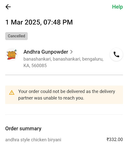 On March 1, 2025, I placed order ONDC_703172RoPLfc through Ola for food from Andhra Gunpowder. The assigned delivery agent contacted me, stating the ordered item was unavailable and requested I cancel the order. I promptly requested the agent to seek alternative menu options from the restaurant. The restaurant, however, refused and directed me to contact Ola customer support.