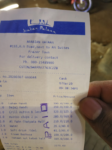 Read moreThe restaurant is dirty, not organized, menu to my surprise have been in bits and pieces. Don't know where is the starters, main course and it's special dishes? To be honest, the menu was a total confusion to me. Staff was really laid back, took their own sweet time to take my order. Finally I pinned down to a dish called Grilled mutton, though one page of the menu was INR 250, the other page was overwritten with the pen as INR 290. Finally when the dish arrived on my plate the grilled mutton to any common man understanding it should be served hot after grilling the meat, but I was caught in awe when they served cold mutton grill. Thanks to Arabian Mataam. Cudos to these guys. Finally when the bill arrived it was INR 300. The beauty about this restaurant is that they don't accept cards, no paytm, gpay etc., I had to go all the way to the ATM at 11.20 PM and pay them. So guys please I would suggest go to this restaurant at your own risk and if you want to shell out your cash....