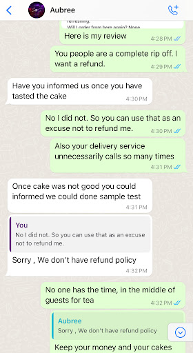 This is the first time I have ordered from here after hearing that it is an award winning bakery with 5 stars and falling for the repetitive ads on Instagram. I should have read the bad reviews if Aubree on Tripadvisor first. They are more accurate than Google reviews. I thought I would order the smaller things first before I tried out a large cake. I am glad I did that. The 2 cupcakes I ordered, vanilla and chocolate, were very ordinary. The cakes were dry and tasteless where cupcakes have to be rich and moist. I think these cakes are kept frozen and defrosted because they certainly weren’t fresh. The buttercream icing leaves an oily taste in the mouth. The jam butter biscuits looked large and vibrant but the taste was equally mediocre and there was certainly no butter used. My local bakery does a far better job with biscuits and cakes at a far more reasonable price. The only thing I liked was the New York cheesecake. It was light, mildly sweet and refreshing. Will I order from here again? Nope. The stars I have given are for presentation and for the delivery. 13th April: The Aubree customer service sent a message today asking me to leave a review on Google. When I told them the cakes were stale they actually suggested that I should have called them so that they could do a “sample test”. Are these stools for them to take a sample test? Plus it is such arrogance because it means they don’t believe the customer, and frankly who has the time to call them up and wait for them to come over to take their blessed sample test to justify their stale cakes when there are...