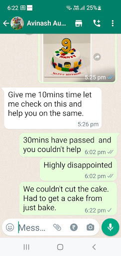 I even enquired about this issue and the response I received is will check with the chef and sorry for the inconvinience. We as customers rely of places like these to order cakes for special occasions cause we are not masters of fancy cake making.. If professional places like these make such blunders and just end by saying sorry then I would rather prefer to bake a cake myself and feel sorry than to pay for it and be disappointed.