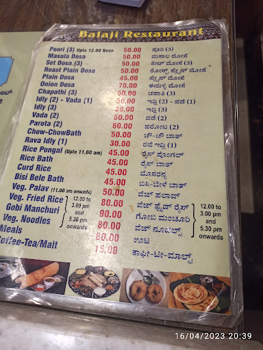 Read moreI went there with Wife and my son. We just landed in BLR City station (KSR) early in the morning. Our hotel check in was at 12 PM (????) So, we used the railway lounge facility at KSR to get fresh and then we needed breakfast. So, we went to Balaji as it is right at the station. Please be advised that it is a fast food restaurant where floating is high. Don't expect very courteous service. If you have lot of luggage, don't go. If you are planning for a leisurely meal, this is not the place. You better eat fast and go. They are very busy. The food is very nice. We had several items like Idly, Dosa and Poori. All are good and served hot. The place is clean enough. Take your own water or buy a bottle. Price is reasonable. I would definitely go there.again if I go...
