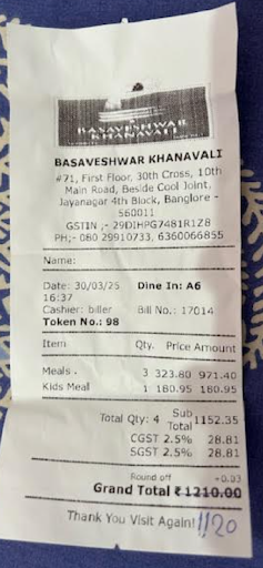 I still give them 4 stars coz there were lot of hiccups while serving. Many items they forgot to serve and were brought only when asked repeatedly. Serving was slower even though the restaurant was not too rush. Non locals are at service and I guess they are still learning and understanding the North Karnataka culture and food and would give them the benefit of doubt for hiccups while serving.
