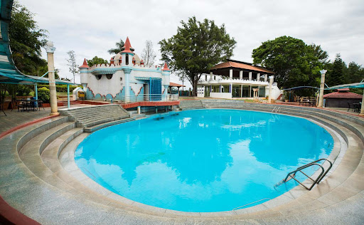 There is a swimming pool here around which is the seating arrangement for people to enjoy lunch/dinner/drinks.