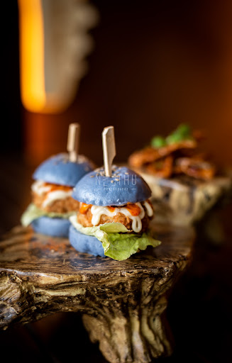 ⢠Corn Cakes Sliders, Thai Chilli Jam & Lotus Stem Chips - Butterfly Pea Flower Buns stuffed with Thai Corn Patties. These were really good in taste.