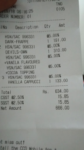 Read moreI had such a worst experience with this branch of CCD. The staff doesn't know how to behave with the customers. They don't have minimum sense of how to treat the customers. I received the wrong order, n when told the staff , he didn't convey the proper message to manager. They treat customers as if we are their servants or something. They called me n made me wait to talk to him just because he was busy. They served the wrong order n rudely asked us to pay for it. The staff has the rudest behavior iI have seen ever. Our ordor was given in installments n too late. All i can is Lazy staff with rudest n inappropriate behavior with customers especially with ladies n...