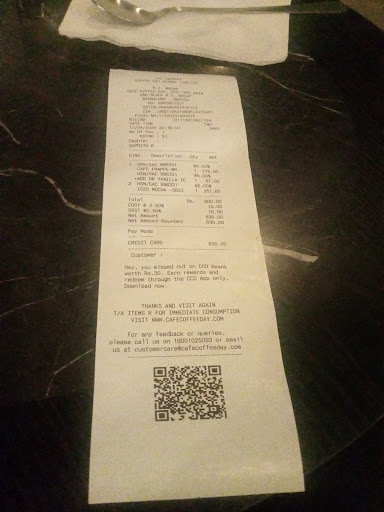 Read morePoor service and managment needs quality check First of all let me tell you ccd is not what it used to be it now it is slowly turning out to be a worst case scenario while the coffee is not that bad the other dishes on the menu are never available and their shelf is always empty and this is now a repeated phenomenon they have pastries whcih will rip off your pocket and the airconditioner will be delibrately switched off or low once you are done with your snack that is really very very low profile. I didnt except that ccd will stoop so low one day its shocking as well as sad that after paying 1000 bucks on a few coffee shots one has to put up with such poor service and callous attitude.