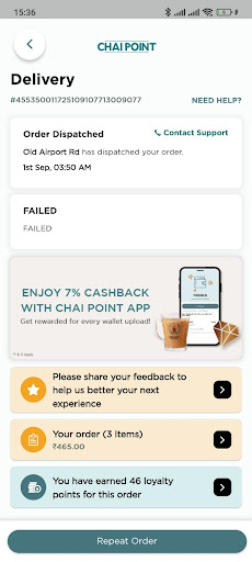 Read moreI write this review with great disappointment. As much as the brand is great and deliveres good food, they are not a fully honest brand. I have ordered from their app multiple times. About 2 weeks back i placed an order on their app and made the payment. After waiting for more than an hour and half when i tried to look for help as my order wasnt recieved it was quite the usual that they had no one answer the customer care number and the app said order dispatched but the address section said failed. Now after multiple followups on the emails I have been told that there was a "INTERNAL INVESTIGATION" conducted and the order was delivered and no refund. Its sad that they think it was all about the money and not the Chai. Its of ourse not a big deal when it is one customer and one failed delivery but when multiplied with 100 customer of 1000 customers it is a big deal. Please do enjoy the beautiful tea they serve but refrain from profiting them by...