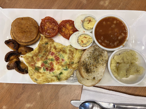 We had the English breakfast (one with salami and the other with sausages) and it went horribly wrong, the sausages, mushrooms, the salami, and the tomatoes were badly done and burnt. Their coating/masala was black in colour. They seem to have been cooked with old oil and tasted really bad.. the breakfasts missed baked beans, mashed potatoes as well as the boiled egg.
