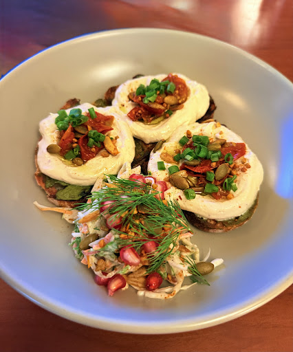 As for the food — it was a mixed bag. The hummus with roasted roots and seeds was quite nice and balanced. My partner enjoyed the jackfruit tacos, but I couldn’t get used to the flavor. I had high expectations from the cinnamon French toast, but it lacked the fluffiness and was overloaded with fruits — felt more like a fruit platter on toast. The cacao shake was bitter to the point of being unpleasant, and even when remade, it didn’t really improve much. Might be a personal preference, but I found the food lacking in depth and flavor overall.