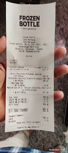 Worst experience faced, there are judging people by dress and looks, first we want to wear nicely dressed to go and buy there. I wore night track pants and a T-shirt and went to the Frozen bottle to buy some milkshakes, so check the menu and ordered 3 milkshakes, then there are tell me the costs of the milkshakes in the way like are you willing to buy this. In the menu the prices are there right, then why should you ask twice and tell about the price and again tell about extra charges for the parcel 15 rupee, 3 milkshakes cost about 500 , if we care about 15 rupees. Look twice at me and judge simply, I learned a new lesson from this. Again I ordered 3 macrons, then, I expected a question form them like, which flavor you want, but instead of that, there told 3 macrons are nearly cost 270 like that,and there dont give same flavors, 3 of then, there given different flavors. There are mention of extra 15 charges for the parcel, so why didn't you mention the chargers of CGST and SGST which is more then 150(cost of 1 regular milkshake) and i was pay the bill by card, the payment was done and i got message, the cashier was conform it, but the other person telling that not credited and check twice, after the bill generated automatically after the payment, the he check the Bill twice and confirmed the order.