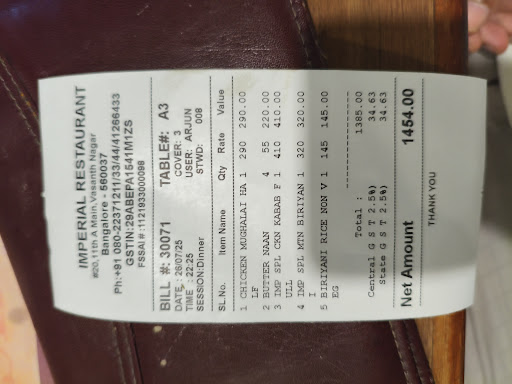 Read moreImperial restaurant was known to me since I stepped into Bangalore since 1987. I was frequenting the one at Residency Road quite often and used to occupy the quite place in rhe first floor and was eating especially kerala parotta and kababs, the specimen indications of the imperial restaurant at that time. There were regular customers for these two items. Except that the Dal they used to give was a bit watery, I never stopped going there. These restaurants were even open at the time of the riots in 1992, when I ate dinner at 1.30 am in the morning on a curfew day after wandering alll over Bangalore,bat residency road Imperial, for a night bite as I was a bachelor.