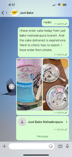 I immediately contacted the Just Bake representative, who acknowledged my concern and mentioned they would check with the owner and call me back. However, after that, my calls were not answered. The next day, I tried reaching out again via calls and WhatsApp (both personal and official numbers), but there was no response.