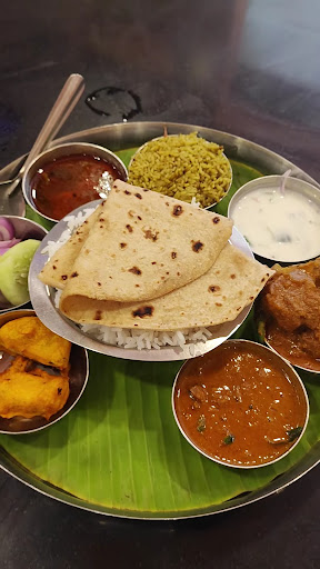 The mutton meals feature a delightful assortment of items, including biryani rice and white rice, providing a choice for those who prefer different types of rice. The mutton curry is a highlight, showcasing the rich and aromatic flavors of the meat, while the chicken kebab adds a touch of indulgence to the meal. The egg bhajji and vegetable sides complement the main dishes, adding depth and variety to the meal.