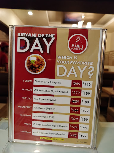 Read moreIf you are looking for a delicious and satisfying biryani, Mani’s Dum Biryani is the place to go. Mani’s Dum Biryani is a popular QSR chain that specializes in fresh and flavourful biryanis, made with aged long grain basmati rice, aromatic Indian spices, tender marinated meats and fresh veggies. They have a variety of biryanis to choose from, such as chicken kabab biryani, andhra paneer biryani, fish biryani, mutton biryani and more. They also offer bucket biryanis and family biryanis for large groups and parties.