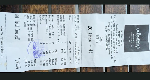 Read moreFor those looking for a cheap cleanse, Nandhini Deluxe offers an 'Unlimited Meals' experience that truly tests your limits where the dal was like sambar, the real sambar might make you question your life choices extremely bad, and the rasam instills an existential dread about taking risks. The curd, shockingly, manages to go wrong in ways only Nandhini can invent, while the sweets taste like they were drafted in from a vendor who prefers profit over pastry. Service is delivered at an Olympic snail pace, with staff looking like they're either unpaid interns or auditioning for a sleepwalking competition.