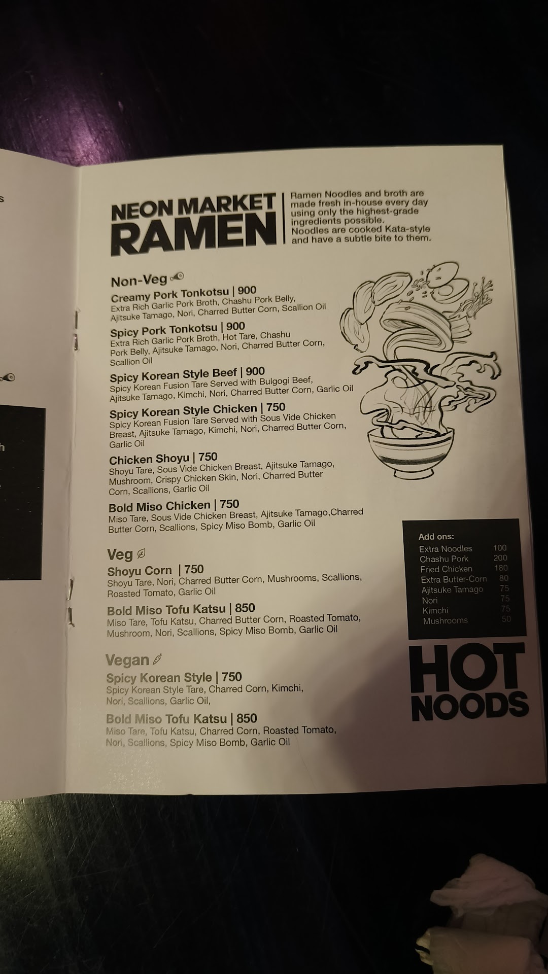 Read moreTrying out ramen noodles has been on my bucket list for so long. I have saved a bunch of top ramen places in and around Bangalore. One day, while scrolling through my feed, a reel popped up about Bangalore's midnight food culture, showing Neon Market; the name was catchy, and what caught my eye was the ramen. A midnight food joint in Indiranagar, it opens at 12 a.m., I guess, but to experience the vibe, you need to go after 10 p.m. Before going, I checked the reviews; they were pretty good, and someone commented it was better than Naru Noodle Bar. I went yesterday around 11 p.m.; the tables were all occupied, but we were seated within 5 minutes. There was a cover charge of 900 rupees per person i guess it was due to weekend rush, which is redeemable at the restaurant. Just like the name, the interior highlighted neon lights; the glass walls around the shop had a tinted effect that reflected all around the shop, so you could watch everything.