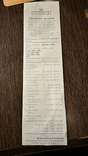 Read morePakashala is a franchisee mid range restaurant with several branches all over Bangalore and beyond including Singapore. It is one of those mid level fine dine restaurants having fancy names and serving south and north Indian cuisine along with indo Chinese dishes. Receipe for all dishes is typical and north Indian graves and rice are oil rich. North Indian breads such as roti or nan can be eaten while they are fresh and hot lest they become leathery while cold and it could be a challenge for elderly and those with sensitive teeth and digestive system. Most of the graves have oily texture and tastes similar. This is not wholly a negetive remark but this is how North Indian and indo Chinese menu tastes in hundreds of such restaurants in Bengaluru. Most of the visitors 6 appear to be happy about it. If you are expecting soft fluffy and invitingly crispy rotis or Kulcha, please look elsewhere. There are a few restaurants serving authentic fare at a premium price.. The restaurant is roomy and the seating is comfortable. The staff are attentive and courteous. There's no special kids menu. Dining on a holiday wouldn't be a leisurely affair due to more than average patrons. On week days you have an unhurried lunch with family and friends at ₹600 to ₹1000 per head if you share graves and rice. Remember the so-called Biriyani is nothing but Palav or typical oil rich...