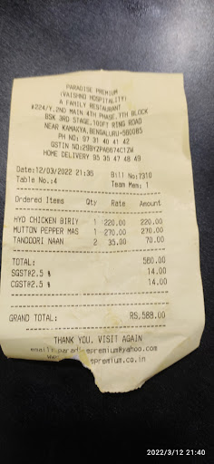 Read moreI recently dined at Paradise Premium Family Restaurant. The ambience present there was so good and peaceful. The Management and the staff members were friendly. Here comes the main plot, every item we ordered was good but steal of the show was "Hyderabadi Biryani","Naan with Butter Chicken" and "Chicken kebab". Biriyani Rice was so flavourful and chicken was cooked properly. Naan with butter chicken was excellent. Highly recommend it!! Last but not the least Chicken kebab was top notch, kebab was so crispy and juicy. Highly recommend...