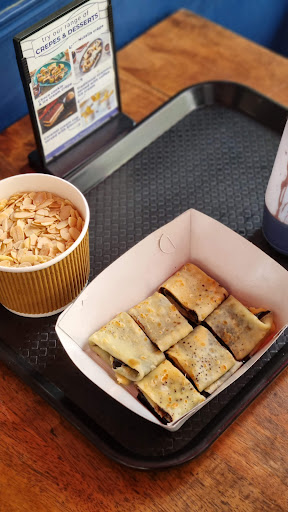 On the food side, our order was onion rings, loaded chicken fries, an assortment of paninis and chocolate crepe, along with some great dips. The onion rings were crunchy and went great with the pesto dip. Must have dish. Loaded fries were true to the name. Loaded, messy but delicious nonetheless. In paninis, we went with multigrain bread and fillings of chicken, lamb and a vegetarian one as well. The chicken one was called Michel and contained peri peri chicken, fresh mozzarella, sliced onions and garlic aioli. I absolutely loved it. There was another called hugo with fried chicken, sun dried tomatoes, lettuce and basil aioli. It was pretty neat as well. The lamb one is Victor made with crumbled lamb, red paprika, onions, jalapenos and garlic aioli. Estelle was the veg one with roasted veggies, fresh mozzarella, jalapenos and olive tapenade. The portion size is excellent and you can also go for a half portion. Chocolate crepe with toasted almonds on top was the perfect end to a really satisfying meal.