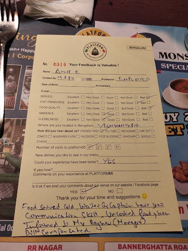 Visited the RR nagar branch after previously having a decent food experience at the Bannerghatta branch ,but unfortunately it was a complete disappointment and a pathetic experience. We ordered starters -Chicken Drumstics(369+tax) and Prawns Rayal vepudu dry(379+tax) which was suggested by the service captain as a good option and would be spicy as well. The Prawns starter was literally served ice cold and had zero flavour to it. When asked about it to the captain, he mentioned it takes time for the trains to deliver the food after preparation and the dish has gone cold in the process. Despite the reasoning sounding absolutely stupid,we did not want to create a fuss. The Chicken Lolipop(5pc) out of which 4pcs were undercooked and still had the batter stuck all over it. When questioned about it,the service captain said he could only offer to change the dish. We waited for 20-25mins almost for the replacement and later cancelled it as it was getting really frustrating. We ordered Mushroom Babycorn masala(289+tax) and Butter tandoori roti 4pc(356+tax) which was comically expensive and not upto the mark. I am sure we would have gotten a better tasting dish at a road side fast food joint.We also ordered Prawns Biryani(379+tax) which tasted absolutely bland and flavourless. Cold water was not available as well. The waiters serving do not understand local language and barely understand English as well. The Manager Mr.Raghav gave us a 10 percent discount and did not charge us for the prawns starter after a intense frustrating conversation with him. Overall it was one of the worst recent dining experiences I have had. Surely will never be visiting Platform 65 again and would never suggest it to anyone. This place is an absolute joke and uses the toy train delivery as its USP and it's grand looking ambience to rip customers of their money. Do not visit.