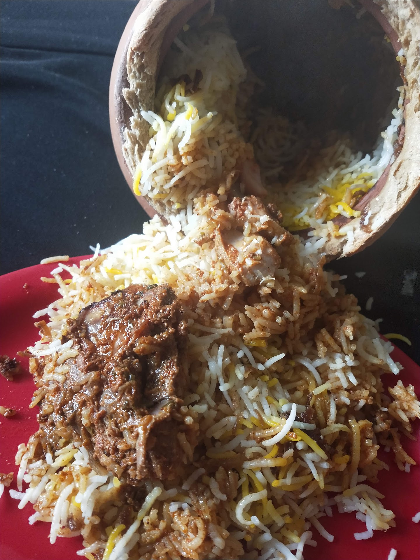 Hyderabadi chicken biryani- the biryani is served in Earthen pots. It has three layers. The bottom has all the fragrant spices and chicken, followed by second layer of fluffy basmati rice and egg. The top is layered with caramelized onions and since it's packed on Earthen pots, all the fragrance and smell is intact. As soon as you open the pot you will start drooling over the smell. Mix up all the layers and enjoy the feast