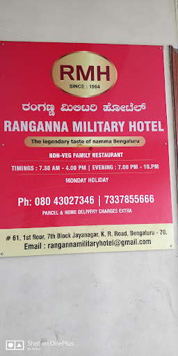 Read moreHello dear foodies...Kya haal chaal...so r u willing to try something different this time..why not try some naati style (country style /Desi style ) food...then don't think just head towards jayanagar for an awesome meal at none other than Ranganna Military hotel (no other franchise they have apart from this)...Bangalore has so many this military style restaurants...and I found this one as one of the best in Bangalore...great food ..awesome taste..homely cooked...family run business and family members only cook...hence you can be rest assured on quality of raw material and the final dish which is getting served on your plate...they do have open kitchen culture so you can see the yummlicious dishes getting cooked infront of you...fast service but very crowded on weekends hence plan to reach on time to avoid waiting or the dishes getting over...the best I like was mutton pulav (mutton biriyani) , anjal fish fry, kheema gojju (mutton keema) , naati chicken fry, mutton kurma and there rasam which is too good..it's always good if you go with group of friends or family members so that you can enjoy multiple dishes... Monday they remain close and timings are 7:30am to 4 pm and 7pm-10pm on rest of the days....dish quantity ok....spicy level good..taste awesome...ambience ok local style not a fancy sort of restaurant, although there is a separate room for family but limited sitting area...parking will be an issue..staff behavior good and prompt service...overall a great experience...a must try and highly recommended.....for more such reviews follow me on Google local guide, Instagram, TripAdvisor or Zomato @ #ankurthefoodie...so enjoy yummy food and have...
