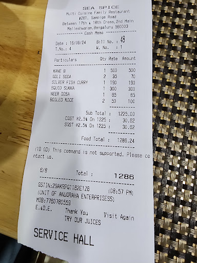 I recently dined at Sea Spice and opted for the Silver Fish Curry and Squid Sukka in Mangalore style with Boiled rice and Neer Dosa, with a plate of LadyFish Rava Fry. The fish was cooked to perfection, flaky and flavorful, and the accompanying sides were equally delicious. The service was attentive and informative, making the entire experience enjoyable.