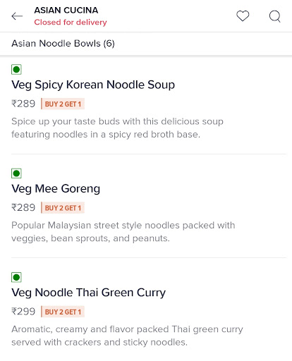 Read moreWhile we have ordered from Asian Cucina on more than one occasion and found the food to be quite decent, the thing that I DID NOT appreciate at all was the one time that I'd ordered a dish called 'Veg Spicy Korean Noodle Soup' and realized to my utter shock after trying it out and having my husband reconfirm my suspicion that it was indeed not an Asian Cucina original dish but was in fact a brand of ready made INSTANT noodles that is easily available on BigBasket and Amazon called Nongshim Nong Shim Ramyun instant Noodles! A packet of these instant noodles which actually costs around 80-90 bucks is being priced at Rs. 289!! Not only is it a total rip off, this approach itself is highly misleading, dishonest and unethical.