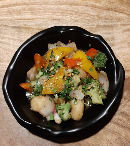 Broccoli, water chestnut & silken tofu gyoza These pan-fried dumplings are traditional Chinese delicacies made of wheat flour wrapping a sautéed mixture of diced broccoli, water chestnuts & tofu. It's a pleasant change from the Momos usually consisting of paneer & other Indian fillings used. The gyōza has an authentic taste about it with the garlic finely infused in the filling & a bite with the dipping sauce, made of soy sauce, rice vinegar & layu (Japanese chilli oil), is what you would call a perfect starter. Taste : 4/5 Price : 280 /-