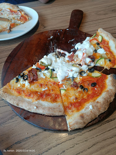 Read moreI was at this pizzeria for a cheat meal on a Sunday afternoon. It was a sound environment and the vibe of this restaurant was admirable. The waiters were quick, active, patient and kind. The dishes were also being pumped out of the kitchen in an impressive time frame of maximum 8-10 mins. The food on the other hand was quite flattering, considering we are in Bengaluru and we are getting to savour fairly nice Italian cuisine. Their stuffed garlic bread with sun-dried tomatoes and Popo's veggie delight pizza are absolute non-negotiables. However, not everyone may like their hummus with grilled chicken and pita bread. It was the kind of dish which set its standards above average for me. I didn't try the chicken topped pizzas here as I wanted to stick to traditional Italian roots. Probably will give it a shot on another visit. I had ordered their Italian pepperoni and Pig out pizzas and as I said, they were above average. I did trip a little by opting for a burrata as an add on to the pepperoni and it didn't go well. I take the blame. If you consider adding on a burrata, pair it with a spicy pizza to balance the flavours. That'll be the unbeatable combination. Nevertheless, I used the burrata only for the crust and had the pepperoni pizza as it was served. There was no compromise on the quality of ingredients in the dishes which were served. Overall, a very few handful outlets serves out such good Italian dishes in this city. The menu pricing is on the slightly expensive side, which is justified by the gourmet-fying. If increased any further, it wouldn't be reasonable and not all class would be able to afford and savour the delicacies they'll offer. Thank you for having me over. Until next time, hopefully :) Signing 📴,...