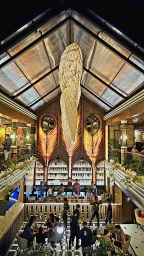 Read moreThis restaurant offers a stunning fusion of nature and artistry, creating an unforgettable dining experience. The interior design is a visual masterpiece—soaring glass ceilings let in abundant natural light, while hanging angel-wing sculptures and vibrant wall art behind the bar add a dramatic flair. Lush greenery cascades from upper balconies, lending a greenhouse-like charm to the space. The seating areas, especially the cozy booths surrounded by plants and a fountain centerpiece, are both stylish and relaxing, perfect for intimate conversations or group gatherings.