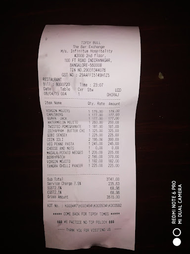 I am sorry I made you guys read through these bunch of paragraphs but lastly I want to say that please share your reviews on the spot and give them a chance to improve and work for the betterment. We all learn from mistakes/experiences but a genuine feedback can help in quicker improvement. Keep it up "Tipsy Bull"!!! One of the best bar exchange outlet...