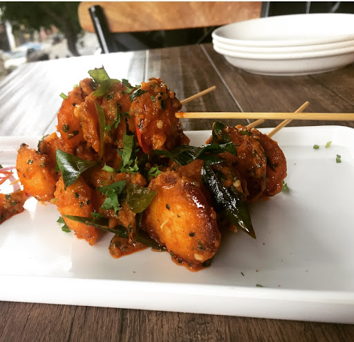 The tastefully done interiors are a treat for all music lovers, old and new. The witty quotes on the wall are catchy and very relatable. You don’t want to miss the huge portrait of the Beatles star, John Lennon. The old cassettes on the wall take you on a nostalgic ride back to your tweens. The best of the cocktails I tried, has to be the house signature “What’s in a name”. The sparkling wine, vodka with pomegranates actually made me think of Daiquiris, weirdly enough since Daiquiris have base of rum. Nonetheless, before I knew it I was in my happy zone. The appetizers were brilliant – Water Chestnut in a hot and sweet glaze had the perfect crunch, although a tad too sweet for my liking. The Lotus Stem in Sweet Chili sauce was insane. Spicy and subtly sweet – perfectly crispy. A not to miss was the Dilli Wale Bread Pakodey, with probably the best potato filling I’ve had in a long time. The blend of flavors, spice and zing made this one unstoppable at just one grab.