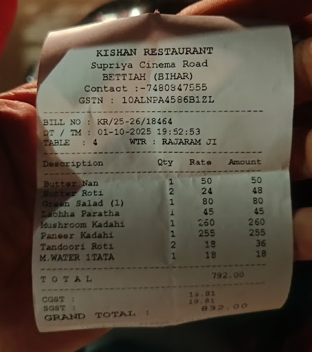 Kishan hotel provides different assortment of sweets, and dining options. We order mix chat from the Chat counter. It was very unappetizing, it was cold and nothing stood out on that Chat plate. We went to the dining area, it has spacious place for different number of people on all the tables. We order mushroom and butter naan. The food took long time to arrive, the mushrooms were a little bit under whelming, not really coalescing with the curry. The Butter Naan was the absolute best. Very Buttery and very naan like, which is not really found in Bettiah. It is good for family outing and family...