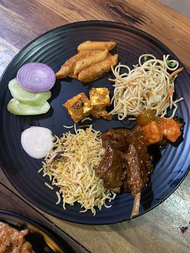 STEAMED RICE ASSORTED INDIAN BREADS HAKKA NOODLES PRAWN IN HOT GARLIC SAUCE KADAI PANEER YELLOW DAL FRY KOLHAPURI VEG MIX SAUCE PASTA MUTTON ROGAN JOSH MURG DUM BIRIYANI VEGETABLE MANCHURIAN