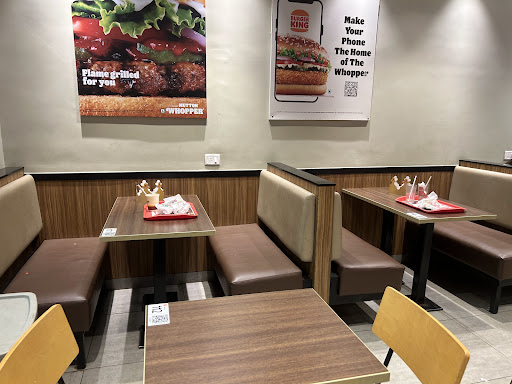 As soon as you enter the restaurant, you'll be greeted by a modern and sleek interior design that exudes a warm and welcoming atmosphere. The seating area is spacious and comfortable, with clean tables and chairs that are well-maintained. The restaurant is well-lit, and the walls are adorned with vibrant colors and Burger King's signature logo. The overall ambiance is lively and inviting, making it an ideal spot for families, friends, and colleagues to enjoy a meal together.