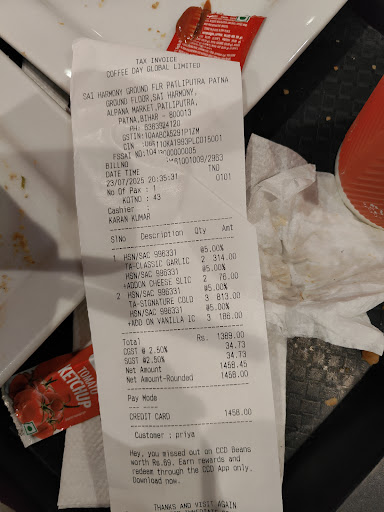 Read moreI visited CCD today and had high expectations. I knew the prices were steep, but I was still looking forward to the experience. While the Belgium chocolate shake was good, the quality of the cheesey mozzarella garlic bread and tandoori chicken double decker sandwich was disappointing. The cheesey mozzarella garlic bread, in particular, was the worst I’ve had compared to other cafes. For the price they charge, they should at least provide better quality and quantity of food. People may enjoy hanging out there with friends, but I won’t be...