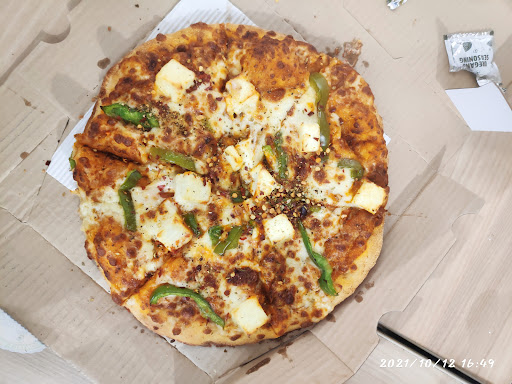 I visited the store and ordered a medium Chicken Dominator (cheese burst) with extra toppings (onion + paneer) and replaced chicken rasher with keema along with a Coke PET bottle.