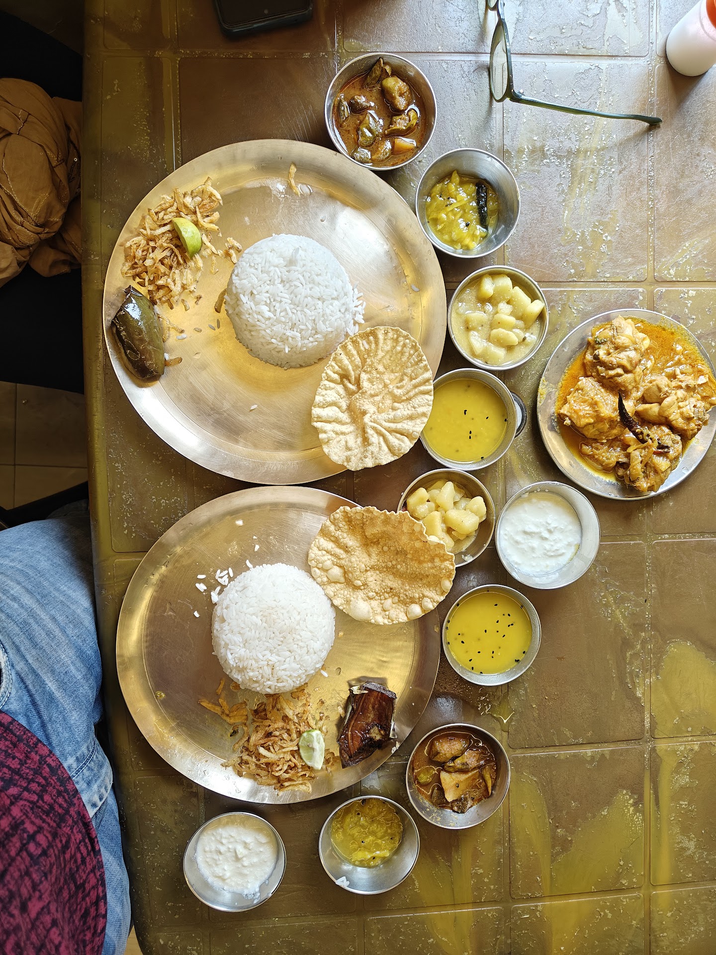 Non veg meals include Rice, dal, thinly sliced potato fry, seasonal vegetable and potato fry, 2 types of veg curry, egg curry/omlette, fish curry/fry, chicken curry(depending on availability), tomato chutney, papad, dahi.