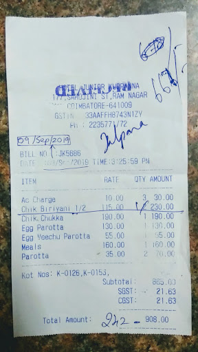 Read moreTo start with, I actually love the biriyani here. So my family and I decided to have lunch at the Ramnagar branch. We were there at 2:30pm which is actually not very late because they serve till 4pm. As soon as entering, we were seated and ordered right away as we had planned to get nonveg meals and mutton biriyani earlier. The waiter told me that the mutton biriyani was over, so we ordered chicken biryani. After waiting for a while, we got the side dishes for biriyani. The waiter came in and told that all biriyani is over as they had a big order for parcel. One would know how we would have felt at that time. We were hungry so we ordered the only items available (parotta, kothu parotta, veechu parotta) all maida and served late. The waiter knowing that we were angry, did not come at all and a server who was young and had nothing to do with the whole ordeal served us and took orders and the check. The manager was nowhere to be found too. When the bill arrived, they had added the chicken biriyani that we never ate. We asked them to change the bill. They left the tax as such and deducted only the price of the biriyani. Then we asked for a change of bill which took forever. We then asked for somebody to complaint for which the cashier replied that she can take the complaint. We complained and there was not a single reply. Just nods and yes-es. I checked swiggy to see whether I am able to order biriyani from the same place. Guess what! Swiggy knew it before us! The swiggy orders were changed from chicken biriyani to egg fried rice which made me feel bad for the customer as well. So much for the people who actually take time to go there to have food. All their hospitality is just a facade and it is total...