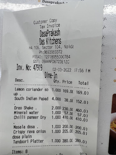 Ā Ā Ā Read moreDasprakash is located in the Sector 104 market. It specialises in South Indian food but also serves North Indian. It is a pure veg AC restaurant. We visited in the morning of 26Sep24 at 8AM which is the opening time. They have an unlimited thali offer with limited items (Rs. 300). However, we opted for a la carte - had rawa onion masala dosa (2 nos), vada (4pcs) and filter coffee (3). The bill was around Rs. 1200 - reasonable for ac dining. The dosa was good and fresh with ample fillings. The sambar was hot and refill sevice was quick. Coffee has always been excellent at Dasprakash - do ask them to make is strong. The ambience could be improved. The ground floor is not too large and lighting could be improved, especially when there is new competition next door. The food quality has always been good though service sometimes lags later in the day. The dishes are good but not unique.