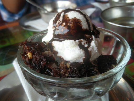 #Rapchik Brownie with Ice Cream- this for me is a killer combo of hot and cold and I prefer to have this dish where ever I can get my hands on it. A Hot brownie alone with a vanilla ice cream topped with Hit chocolate sauce.