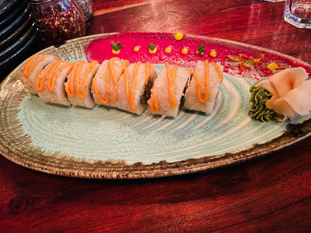 FOOD - We ordered the following - Veg Asparagus Sushi - Very peculiar taste, some would like and some would not. For me, it was an okay dish. I liked the sesame seed sauce. The rice was a little hard for my liking. Also, my tastebuds could not adjust to the extremely pungent wasabi. If that is what authentic wasabi is, please keep it the way it was. It just isn't meant for me. Lastly, please rethink if you would like to garnish it with mayo at the top. Does that not take away the authenticity? Veg Salt and Pepper - Tasty, nothing out of the world though. Will I order it again? Yes. It is like a go-to starter when you donot have a particular choice. Shrooms (Mushroom Dimsums) - Delighted! Super tasty dimsums. The mushroom filling was awesome, and the outer layer was also soft and non sticky in the mouth. Particularly loved this one. Veg Primavera Pizza - The waiter asked us to try Farmhouse Pizza, but we stuck with this one, and were not disappointed. Super tasty pizza, with oregano and chilli flakes as the sides. If I were to nitpick, more burnt garlic should be added and should be spread more uniformly across the pizza, as it really accentuated the taste. Cheese Sauce Pasta - My child loved it, and I would say it didn't disappoint me. It was okay for me, I can order it again. My only complaint was the potion size for pasta was quite small. Mezze (Middle eastern platter) - I enjoyed this one. Small pita breads with falafel and hummus and various other fillings along with flavoured lettuce and olives, I enjoyed having this one.