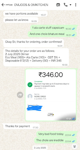Read more"I recently tried a meal from Omkitchen and I was thoroughly impressed. The food was not only delicious but also made from high-quality organic ingredients, which really made a difference in taste. The home style prepration gave the meal a comforting, authentic feel. Additionally, the packaging was excellent eco-friendly and well- designed, keeping everything fresh and secured. Overall, it was a delightful experience that I would highly recommend for anyone seeking wholesome, organic meals with a...