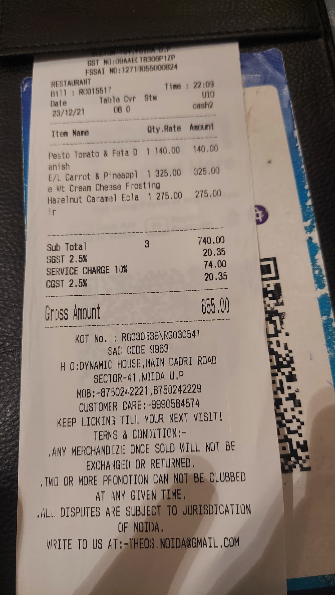 We had gone to starling mall for dinner and chose to have our desserts at theos. We ordered 3 items- 1 savoury and 2 desserts. It took them precisely 25 mins to serve the all 3 ready to eat items that we had ordered.