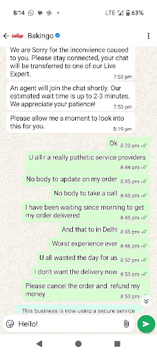 Read moreNot even deserve one star , horrible experience with the company. No delivery update and no response from the customer care. I ordered cake for my parent’s anniversary and they destroyed our occasion. The cake was ordered at 10.00 am in the morning and it was not delivered till 11.30 in the night . The delivery time mentioned in the website which I selected was between 9.00 am to 9.00 pm and since it was delivered till 9.00 pm we asked for the cancellation and refund of money but they didn’t cancelled it and without our convent delivered it at 11. 30 pm in the night. My parents unknowingly accepted the delivery which I have actually cancelled. I suggest you all not to order any cake from this company as it is not confined to one place because its customer care is not responsive and doesn’t care about...